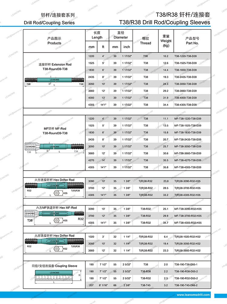 LEANOMS OEM High Carbon Steel Materials Drill Produžetak Dužina šipke: 600mm do 6400mm Vrhunska oprema za bušenje čekića za duge rupe, uključujući svrdla, spojne rukave, produžni drifter šipke, i adaptere za koljenice. Visoke stope penetracije, ravna, visokokvalitetan bušilica rupa, i niski ukupni troškovi proizvodnje su sve osobine našeg sistema bušenja.